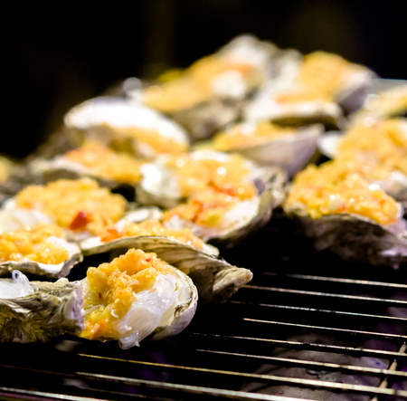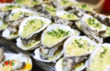 Grilled oysters with garlic butter on metal grill at food market