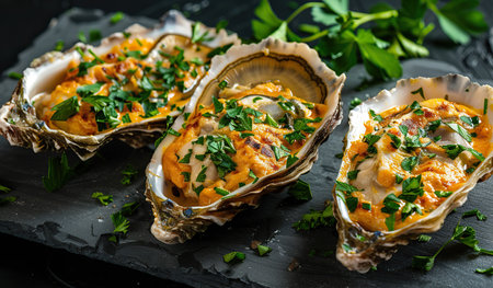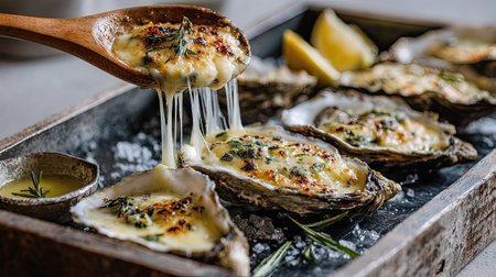 Indulge in this gourmet dish of baked oysters, featuring a rich and creamy topping. Perfect for entertaining or special occasions, this seafood platter delights the senses with its inviting aroma and elegant presentation.