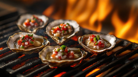 A visually enticing display of grilled oysters topped with fresh herbs and spices, sizzling on a barbecue grill, surrounded by vibrant flames and aromatic smoke.