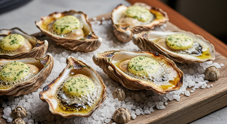 Gourmet baked oysters with herb butter on rock salt bed