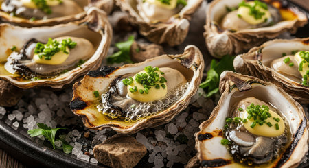 Grilled oysters with herb butter and chives on rock salt