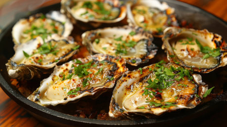 A plate of grilled oysters topped with garlic butter and parsley, sizzling hot and ready to be savored as a delectable seafood dish.