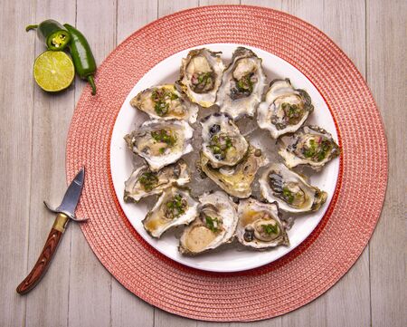 Detail of a plate with fresh shucked oysters with jalapeno & lemon mignonette over wood background