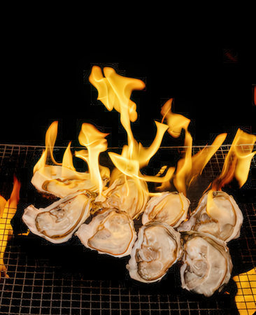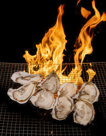 Oysters on a grill with flames on a black background.