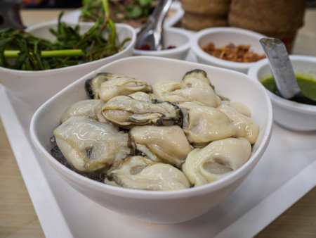 Fresh oysters with flavoring spicy seafood sauce of Thai style food