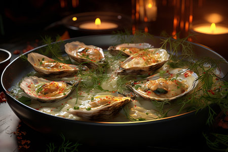 Exquisite oysters in creamy white sauce with fresh herbs for an elegant candlelit dinner setting