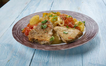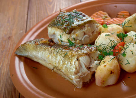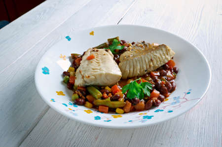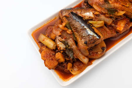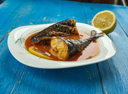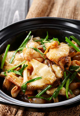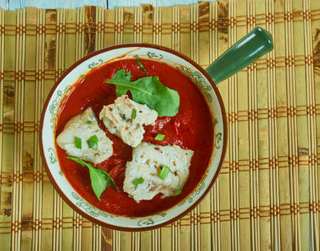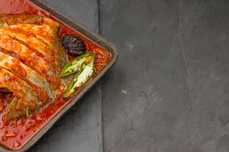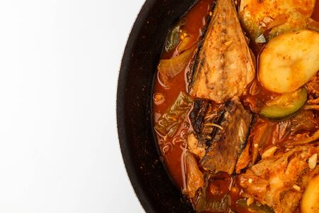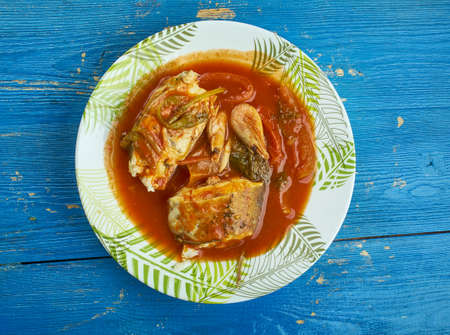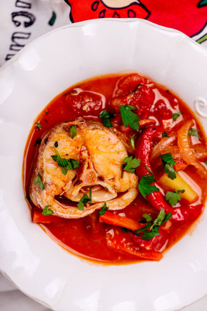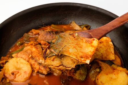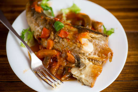 Stew with fish and vegetables. Spicy fish stew. Fish seasoned dish