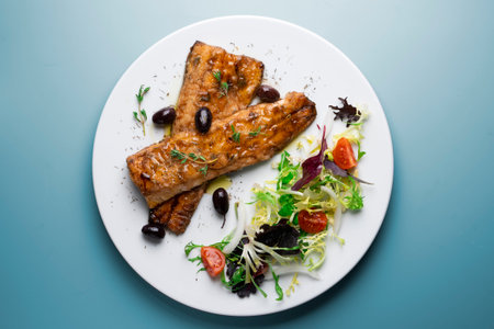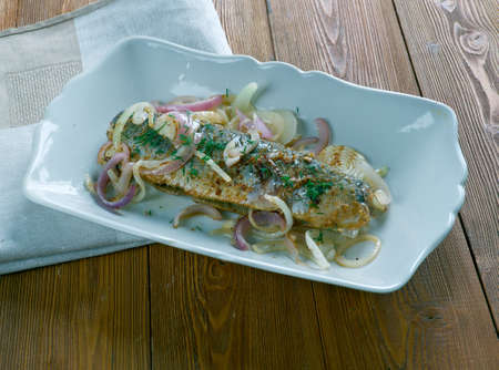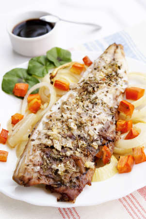 Grilled trout, carp and mullet. Juicy delicacy fish with fried vegetables. Balkan food. close up, on plate. Food recipe background.