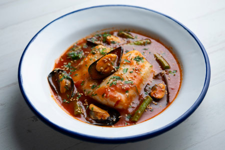 A seafood stew in a white bowl, filled with fish, clams, and tomatoes