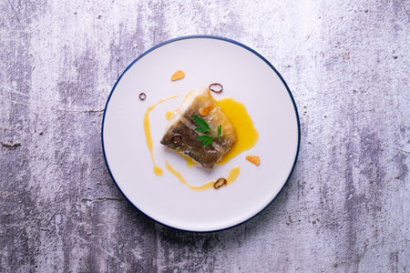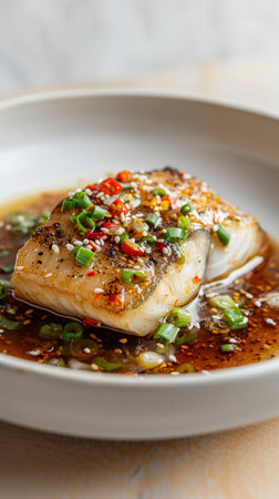 Seabass, golden crispy skin, soy ginger sauce, green onions. Delicious steamed cod fish fillet garnished with green onions and sesame seeds. Gourmet dish served on a white plate