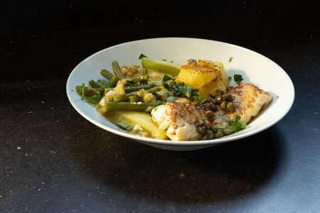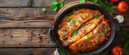 Baked cod white fish in a plate. Dark wooden background. Top view. Copy space
