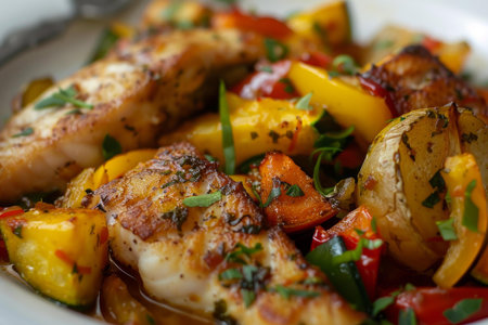 Close up of a seasoned grilled fish fillet alongside a medley of roasted bell peppers and herbs