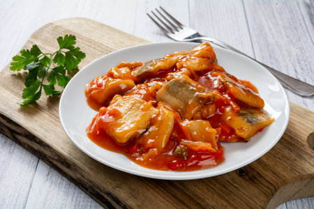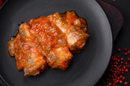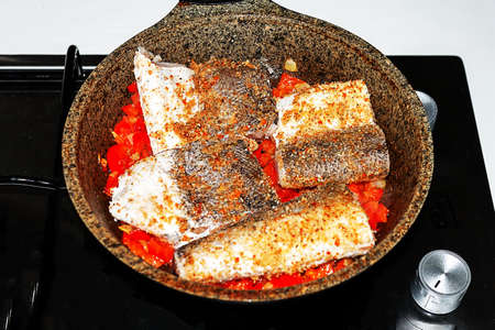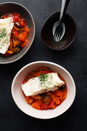 Hake fish cooked in pieces in tomato sauce, stew with peppers and carrots. Hake fish in tomato sauce as a food background for your design.