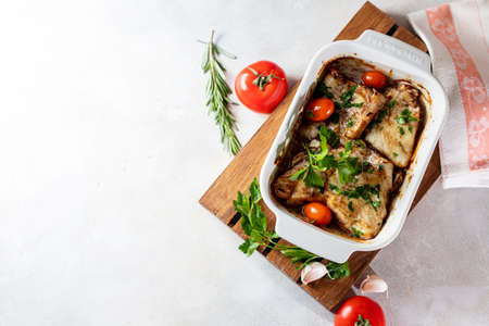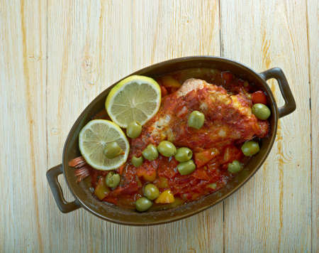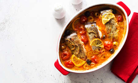 Traditional Sicilian fish with tomatoes, olives, parsley and red pepper in a deep plate on a light background, close up