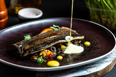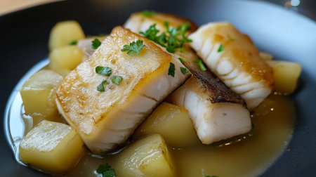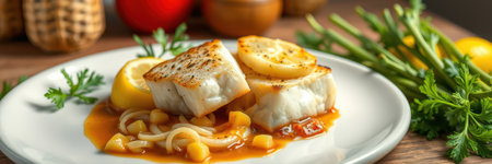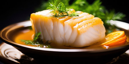 Close-up of a delicious roasted monkfish fillet served with caramelized orange zest, capers, and fennel, creating an elegant and flavorful dish