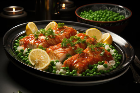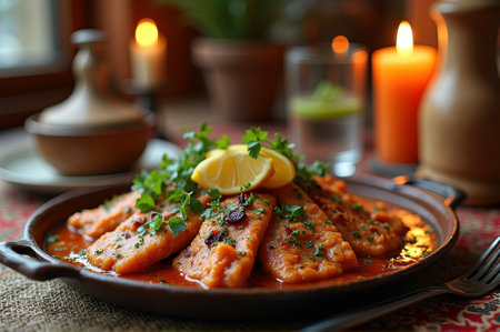 Rustic salmon dish with lemon and herbs in cozy candlelit setting. That the image is generated using AI.