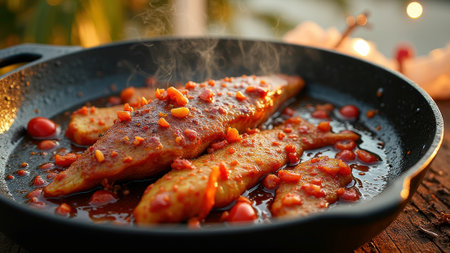That the image is generated using AI. Steaming fish fillet in tomato sauce with cherry tomatoes in sizzling pan.
