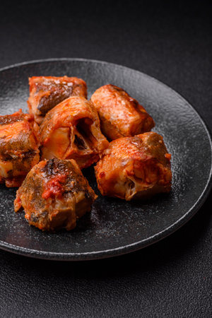 Baked Tilapia fish in tomatoes on a plate. Black background. Top view.