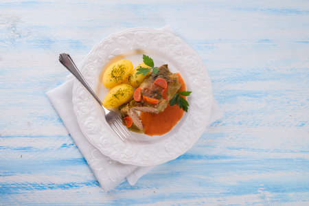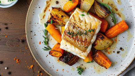 Stewed hake medallions with vegetables. Top view table with decorations.