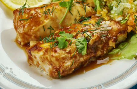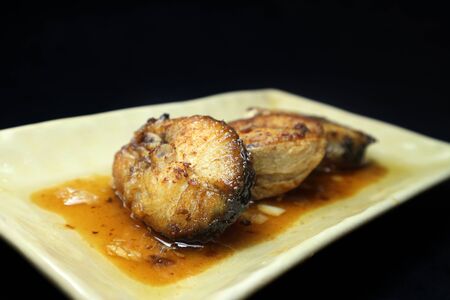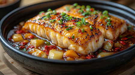 A grilled fish fillet with a savory glaze and garnish of parsley and onions