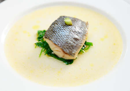 A delicious piece of seared fish rests on a smooth white sauce, garnished with herbs