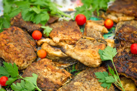 Fried together with spices slices the chickens decorated with leaves of parsley and small tomatoes.