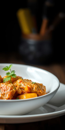 Delicious curry dish with tender meat and a rich sauce served in a white bowl on a wooden table