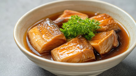 A bowl of rich and flavorful ca kho to, caramelized fish in clay pot, garnished with fresh herbs and served with steamed rice