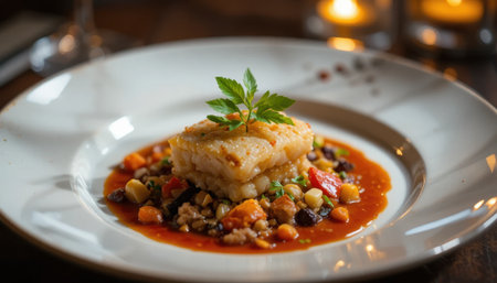 Elegant white plate showcasing premium seafood dish with golden-crusted fish, opened clams, cherry tomatoes, roasted garlic and rosemary in rich broth. Perfect for upscale dining content.