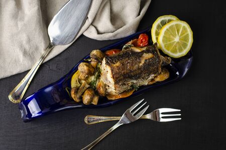 Baked piece of hake fish in the oven with vegetables on a blue plate made from bottle on black background. Healthy eating and keto diet concept. Top view
