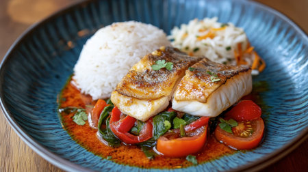 A beautifully arranged plate featuring grilled fish fillet accompanied by fluffy rice and a medley of fresh vegetables, highlighting vibrant colors and flavors.