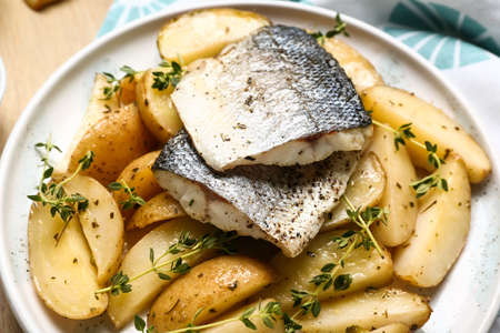 Savor the Perfectly Roasted Delights: Fish and Potatoes, Artfully Presented on a Rustic Wooden Tray- Captivating Image in AR 3:2