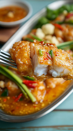 A close-up shot focuses on a succulent piece of glazed fish held by a fork, highlighting the tender, flaky texture of the white fish meat. The glaze glistens with specks of seasoning.