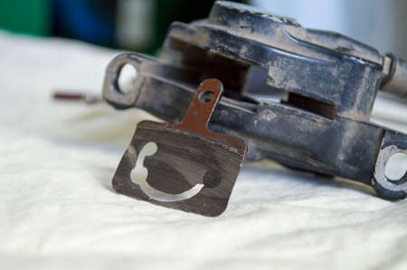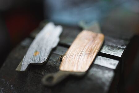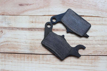 Old disc brake pads of motorcycle isolated on wooden background closeup.