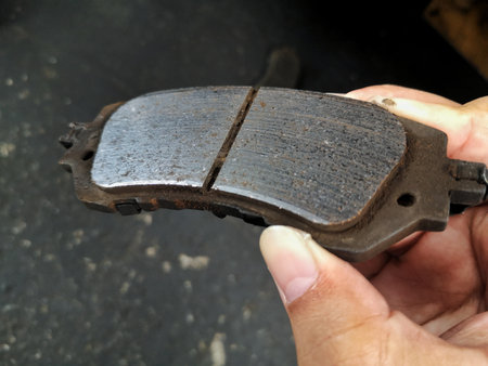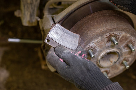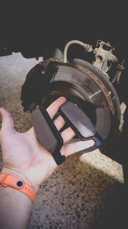 close up to brake pad of the car in hand