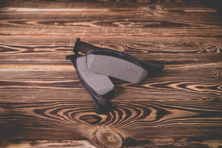 Studio photo of new black car brake pads on a wooden background.