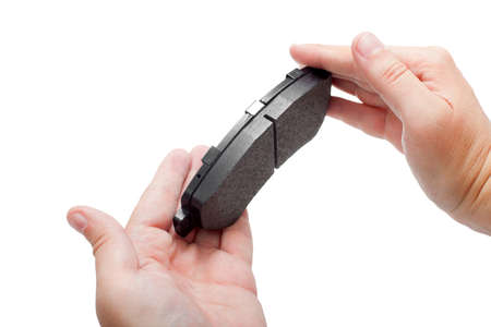 Brake pads in the engineer's hand, isolated.
