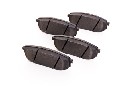 A set of four new automobile brake pads on a white background