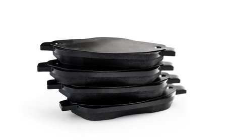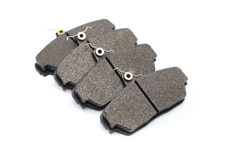 Set of auto brake pads isolated on white background, brake system maintenance, replacement parts for vehicle