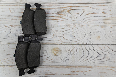 Studio photo of new car brake pads on a white wooden background. Photo with vignetting