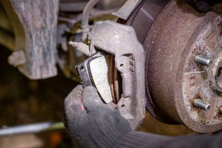 A gloved hand installs a new brake pad into a car caliper, ensuring smooth and safe operation.