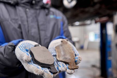 The mechanic holds the old and new brake pads in his hand. Change the old to new brake disc on car in a garage. Auto repair concept.
