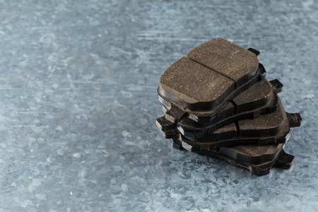 Used worn out car brake pads need to change, close up.