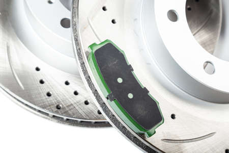 Perforated brake pads next to brake disc on white background isolated object