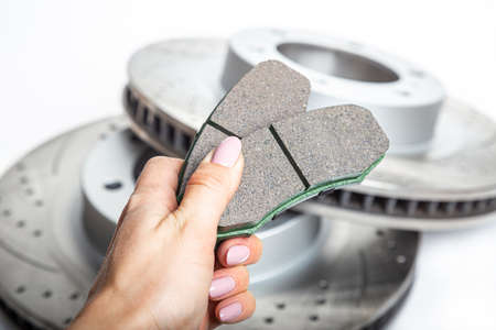 brake pad in hand on background Perforated brake discs isolated on white background