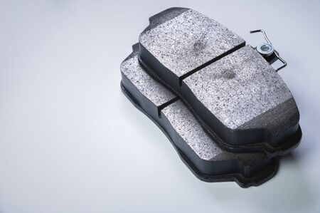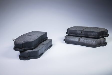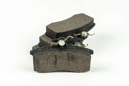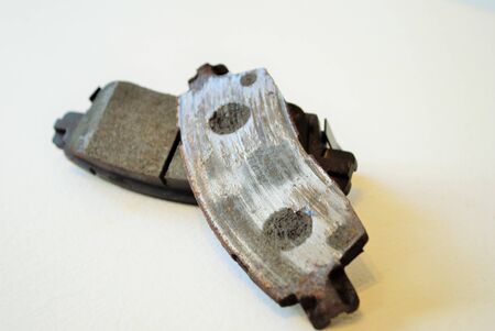 Set of old asbestos brake pads on a white background in a photography studio. Spare part of a car for replacement in a car service or for sale at auto-parsing.