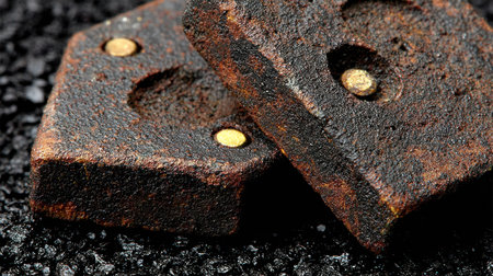 Close-up of heavily oxidized brake components, flanked by scattered fragments, highlighting intense corrosion and the passage of time on mechanical parts.