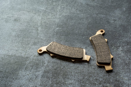 New metallic motorcycle brake pads with pristine brake pads on a gray surface