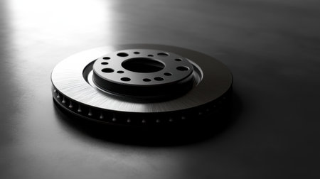A high-quality close-up image of a black brake disc resting on a dark surface, showcasing intricate details suitable for automotive and mechanical projects.