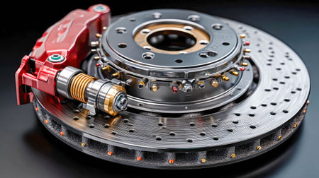A symbol of peak automotive engineering, this high-performance brake disc with its vibrant red caliper stands ready in a futuristic garage.